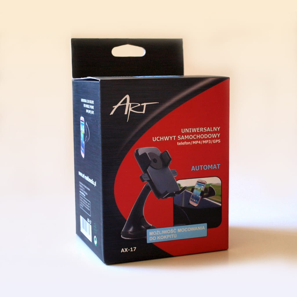 Producent: ART;Symbol producenta: AX-17;Rodzaj produktu: UNIWERSALNY UCHWYT SAMOCHODOWY NA TELEFON/MP4/GPS;Materiał wykonania : Plastik;Kolor: Czarny;Inne cechy: Swobodna regulacja we wszystkich kierunkach;Gwarancja: 24 miesiące;Dopuszczenie do obrotu w RP: Tak;Kraj pochodzenia: Chiny;