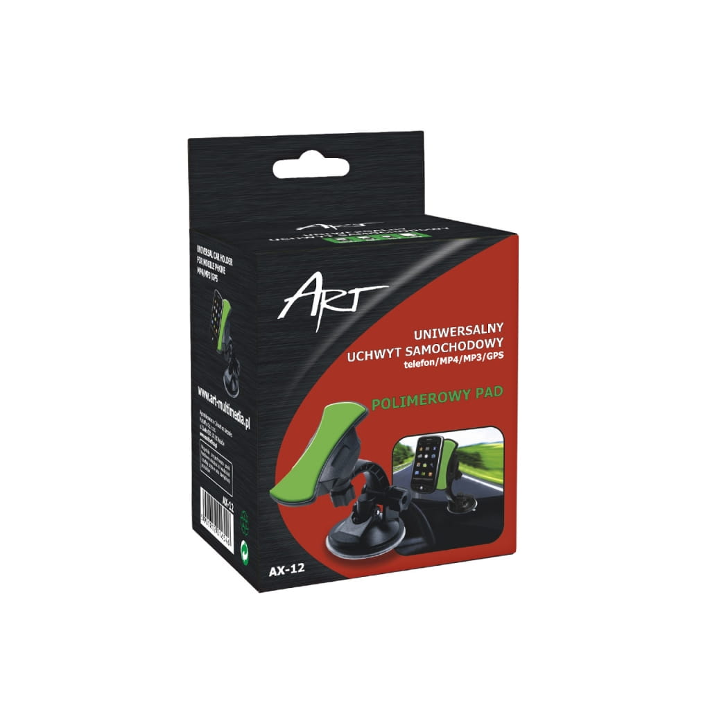 Producent: ART;Symbol producenta: AX-12;Rodzaj produktu: UNIWERSALNY UCHWYT SAMOCHODOWY NA TELEFON/MP4/GPS;Materiał wykonania : Plastik;Kolor: Czarny;Inne cechy: Unikalny polimerowy pad zapewniający przyczepność ( nie pozostawia śladu kleju na telefonie);Gwarancja: 24 miesiące;Dopuszczenie do obrotu w RP: Tak;Kraj pochodzenia: Chiny;