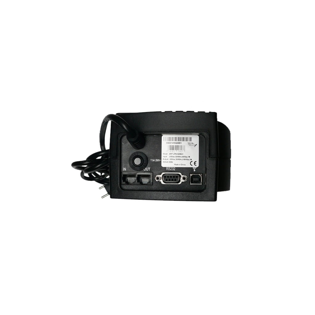 Producent: ART;Symbol producenta: UPS-IN60021;Rodzaj produktu: UPS;Technologia: IN-LINE;Moc pozorna: 600 VA;Współczynnik mocy: 0.5;Czas przełączenia: <5 ms;AVR: Tak;Bateria: 1x 12V / 5Ah;Wyświetlacz LCD: Nie;Dioda sygnalizująca status pracy: Tak;Kształt napięcia wyjściowego: Modyfikowana sinusoida;Napięcie na wyjściu: 230V;Częstotliwość na wyjściu: 50Hz;Ilość gniazd wyjściowych: 2;Zabezpieczenie przeciwprzepięciowe: Tak;Filtr przeciwzakłóceniowy: Nie;Port USB: Tak;Gwarancja: 24/12 miesięcy ;Znak bezpieczeństwa/zgodności: CE;Dopuszczenie do obrotu w RP: Tak;Kraj pochodzenia: Chiny;