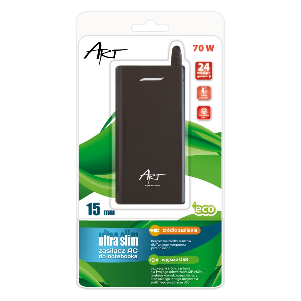 Producent: ART;Symbol producenta: AZ-F70W-5;Rodzaj produktu: Zasilacz sieciowy dedykowany;Przeznaczenie: Zasilanie dla notebook/netbook;Moc: 70W;Zasilanie na wejściu: 230V AC;Zasilanie na wyjściu: 18,5V DC; 3,5A + 5V USB;Dioda sygnalizująca status pracy: Tak;Dodatkowy port USB: Tak;Przykładowa kompatybilność: Wybrane modele HP/Compaq m.in. 2230s, 2510p, 2710p, 6510b, 6515b, 6530b, 6535b, 6710b, 6715b, 6720b, 6730b, 6735s, 6820s, 6830s, 6910p, 8510p;Inne cechy: Polikarbonowa obudowa SLIM wytrzymała na zarysowania;Gwarancja: 24 miesiące;Znak bezpieczeństwa/zgodności: CE;Dopuszczenie do obrotu w RP: Tak;Kraj pochodzenia: Chiny;