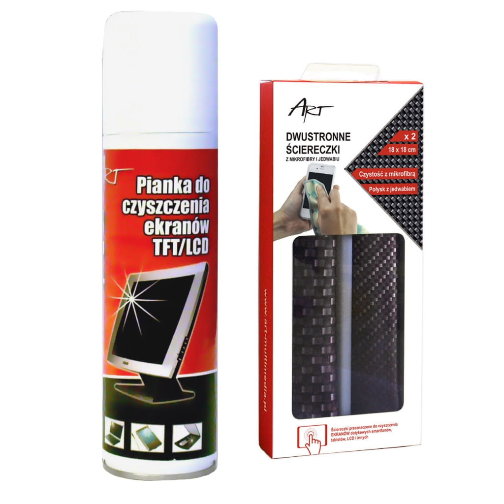 Producent: ART;Symbol producenta: AS-Z01;Rodzaj produktu: Zestaw czyszczący;Skład zestawu: Pianka 250 ml + dwustronne ściereczki z mikrofibry 2szt;Zawartość alkoholu: Nie;Zastosowanie: Do ekranów LCD/ TFT/ Tabletów, Smartfonów i innych ;Inne cechy: Pianka - posiada dobre właściwości antystatyczne, posiada działanie bakteriobójcze, nie pozostawia smug.;Gwarancja: 24 miesiące;Dopuszczenie do obrotu w RP: Tak;Kraj pochodzenia: Chiny;