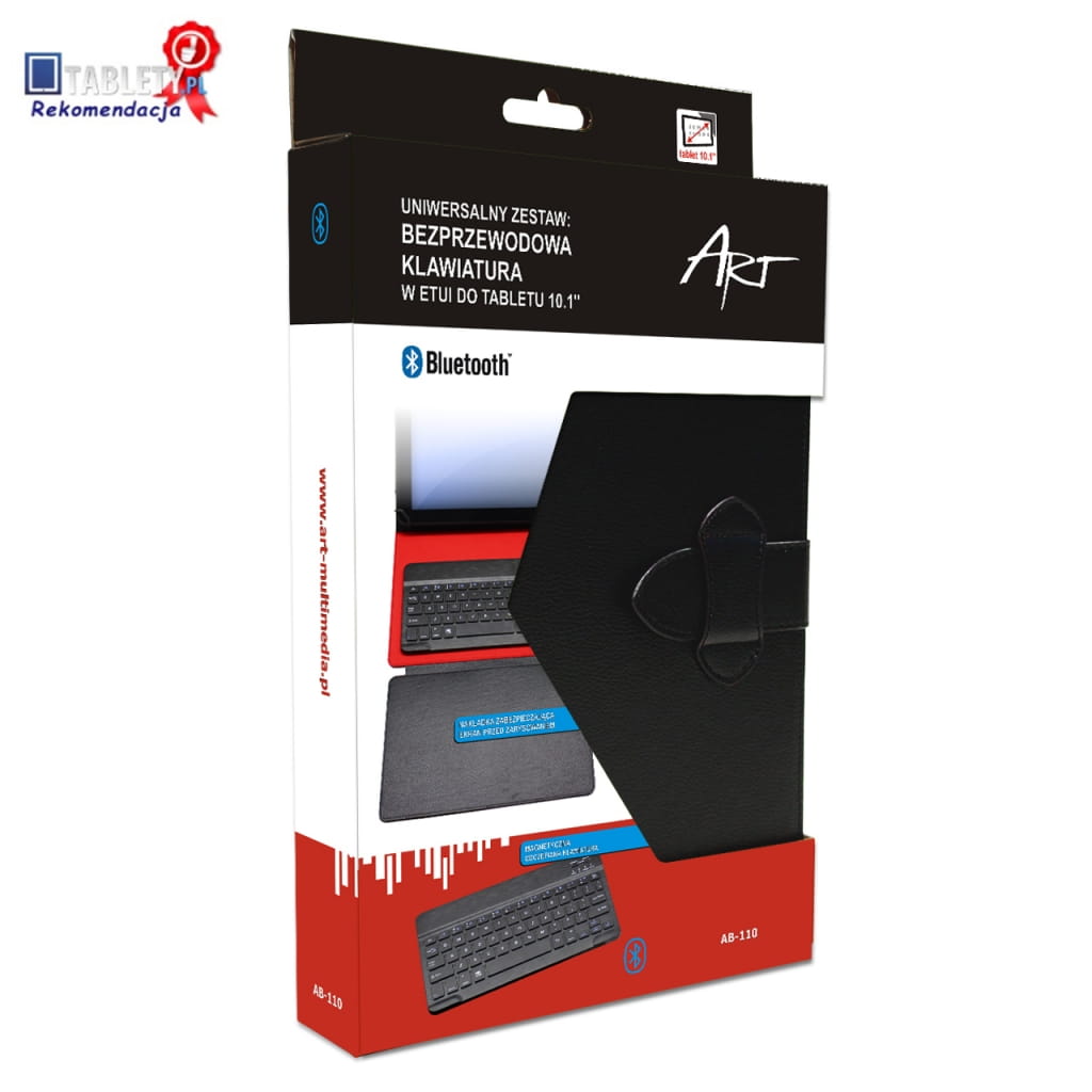 Producent: ART;Symbol producenta: AB-110;Rodzaj produktu: Zestaw: klawiatura bluetooth w etui;Przeznaczenie: Tablety z funkcją bluetooth;Przykładowe modele: Samsung, Sony, Lenovo, Acer, Apple, Overmax, Kiano, Manta, GoClever, Pentagram;Materiał wykonania : Etui - eleganckie tworzywo skóropodobne. Klawiatura: metalowa podstawa oraz wysokiej jakości tworzywo przypominaujące aluminium na wierzchniej warstwie ;Wielkość i rodzaj ekranu: 10.1";Inne cechy: Etui zawiera dodatkową nakładkę zabezpieczającą ekran tabletu przed zarysowaniami;Produkt wyróżniony: Tablety.pl;Link do artykułu: http://www.tablety.pl/akcesoria/art-ab-110-recenzja-etui-z-klawiatura-tabletow/;Gwarancja: 24 miesiące;Znak bezpieczeństwa/zgodności: CE;Dopuszczenie do obrotu w RP: Tak;Kraj pochodzenia: Chiny;