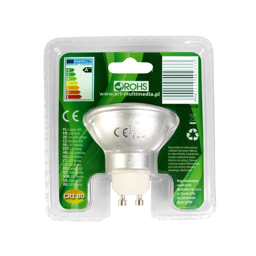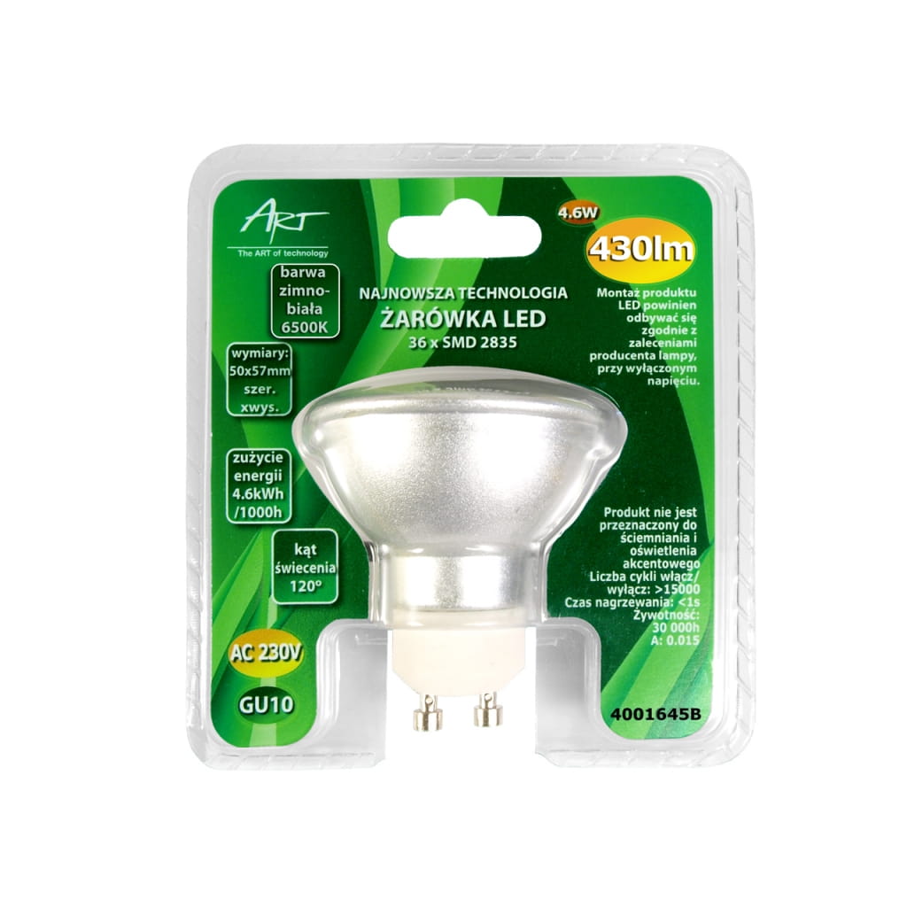 Producent: ART;Symbol producenta: 4001645B;Rodzaj produktu: Żarówka LED;Moc: 4.6W;Mocowanie: GU10;Ilość diod LED: 36;Rodzaj LED: SMD 2835;Napięcie: AC 230V;Barwa światła (K): 6500 (zimno-biała);Moc strumienia świetlnego (lm): 430;Kąt świecenia (st): 120;Szerokość : 50 mm;Wysokość : 57 mm;Materiał wykonania: Aluminium;Wymiary opakowania (mm): 87 x 96 x 55;Gwarancja: 24 miesiące;Zużycie energii: 4.6kWh/1000h;Klasa energetyczna: A++;Liczba cykli włącz/wyłącz: >15 000;Czas nagrzewania: <1s;Trwałość: 30 000h;CRI/Ra: >80;Czas zapłonu: <1s;Współczynnik mocy: 0,6;LLMF: 0,65;Przeznaczenie do ściemniania: Nie;Przeznacznie do oświetlenia akcentowego: Nie;Znak bezpieczeństwa/zgodności: CE;Dopuszczenie do obrotu w RP: Tak;Kraj pochodzenia: Chiny;