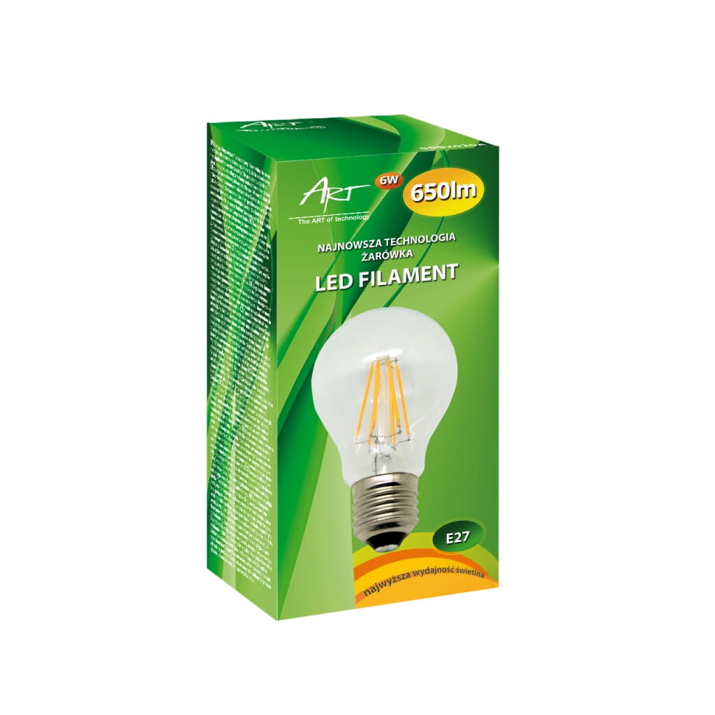 Producent: ART;Symbol producenta: 4000920;Rodzaj produktu: Żarówka LED;Moc: 6W;Mocowanie: E27;Rodzaj LED: LED FILAMENT;Napięcie: AC 230V;Barwa światła (K): 2900 (ciepło-biała);Moc strumienia świetlnego (lm): 650;Kąt świecenia (st): 270;Szerokość : 60 mm;Wysokość : 105 mm;Wymiary opakowania (mm): 65 x 135 x 65;Gwarancja: 24 miesiące;Zużycie energii: 6kWh/1000h;Klasa energetyczna: A++;Liczba cykli włącz/wyłącz: >15 000;Czas nagrzewania: <1s;Trwałość: 30 000h;CRI/Ra: >80;Czas zapłonu: <1s;Współczynnik mocy: 0,6;LLMF: 0,65;Przeznaczenie do ściemniania: Nie;Przeznacznie do oświetlenia akcentowego: Nie;Znak bezpieczeństwa/zgodności: CE;Dopuszczenie do obrotu w RP: Tak;Kraj pochodzenia: Chiny;