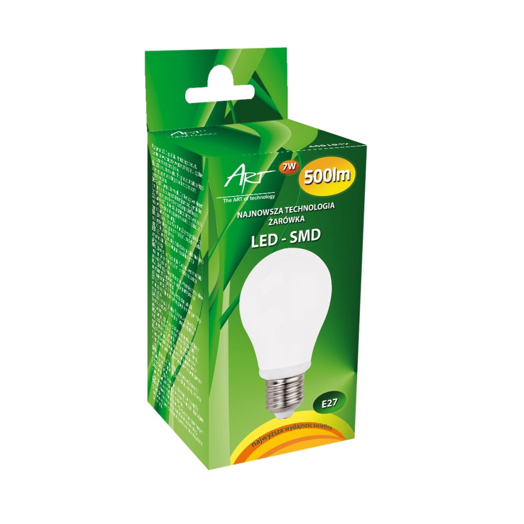 Producent: ART;Symbol producenta: 4001042;Rodzaj produktu: Żarówka LED;Moc: 7W;Mocowanie: E27;Rodzaj LED: SMD;Napięcie: AC 230V;Barwa światła (K): 2900 (ciepło-biała);Moc strumienia świetlnego (lm): 500;Kąt świecenia (st): 360;Szerokość : 60 mm;Wysokość : 104 mm;Wymiary opakowania (mm): 65 x 120 x 65;Inne cechy: Efekt tradycyjnej żarówki;Gwarancja: 24 miesiące;Zużycie energii: 7kWh/1000h;Klasa energetyczna: A+;Liczba cykli włącz/wyłącz: >15 000;Czas nagrzewania: <1s;Trwałość: 30 000h;CRI/Ra: >80;Czas zapłonu: <1s;Współczynnik mocy: 0,6;LLMF: 0,65;Przeznaczenie do ściemniania: Nie;Przeznacznie do oświetlenia akcentowego: Nie;Znak bezpieczeństwa/zgodności: CE;Dopuszczenie do obrotu w RP: Tak;Kraj pochodzenia: Chiny;