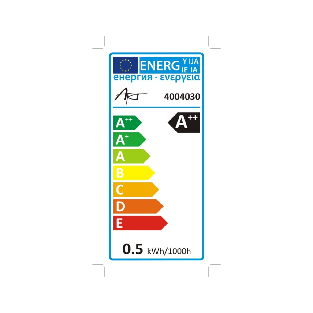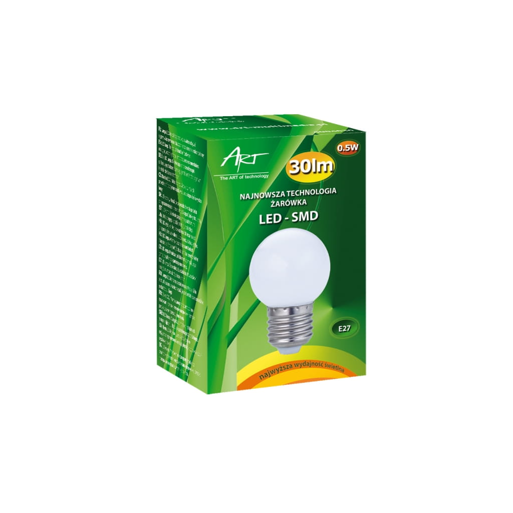 Producent: ART;Symbol producenta: 4004030;Rodzaj produktu: Żarówka LED;Moc: 0,5W;Mocowanie: E27;Rodzaj LED: SMD;Napięcie: AC230V;Barwa światła (K): Biała;Moc strumienia świetlnego (lm): 30;Kąt świecenia (st): 180;Szerokość : 45 mm;Wysokość : 69 mm;Wymiary opakowania (mm): 47 x 72 x 47;Inne cechy: Kolorowa bańka;Gwarancja: 24 miesiące;Zużycie energii: 0.5kWh/1000h;Klasa energetyczna: A++;Liczba cykli włącz/wyłącz: >15 000;Czas nagrzewania: <1s;Trwałość: 30 000h;CRI/Ra: >80;Czas zapłonu: <1s;Współczynnik mocy: 0,6;LLMF: 0,65;Przeznaczenie do ściemniania: Nie;Przeznacznie do oświetlenia akcentowego: Nie;Znak bezpieczeństwa/zgodności: CE;Dopuszczenie do obrotu w RP: Tak;Kraj pochodzenia: Chiny;