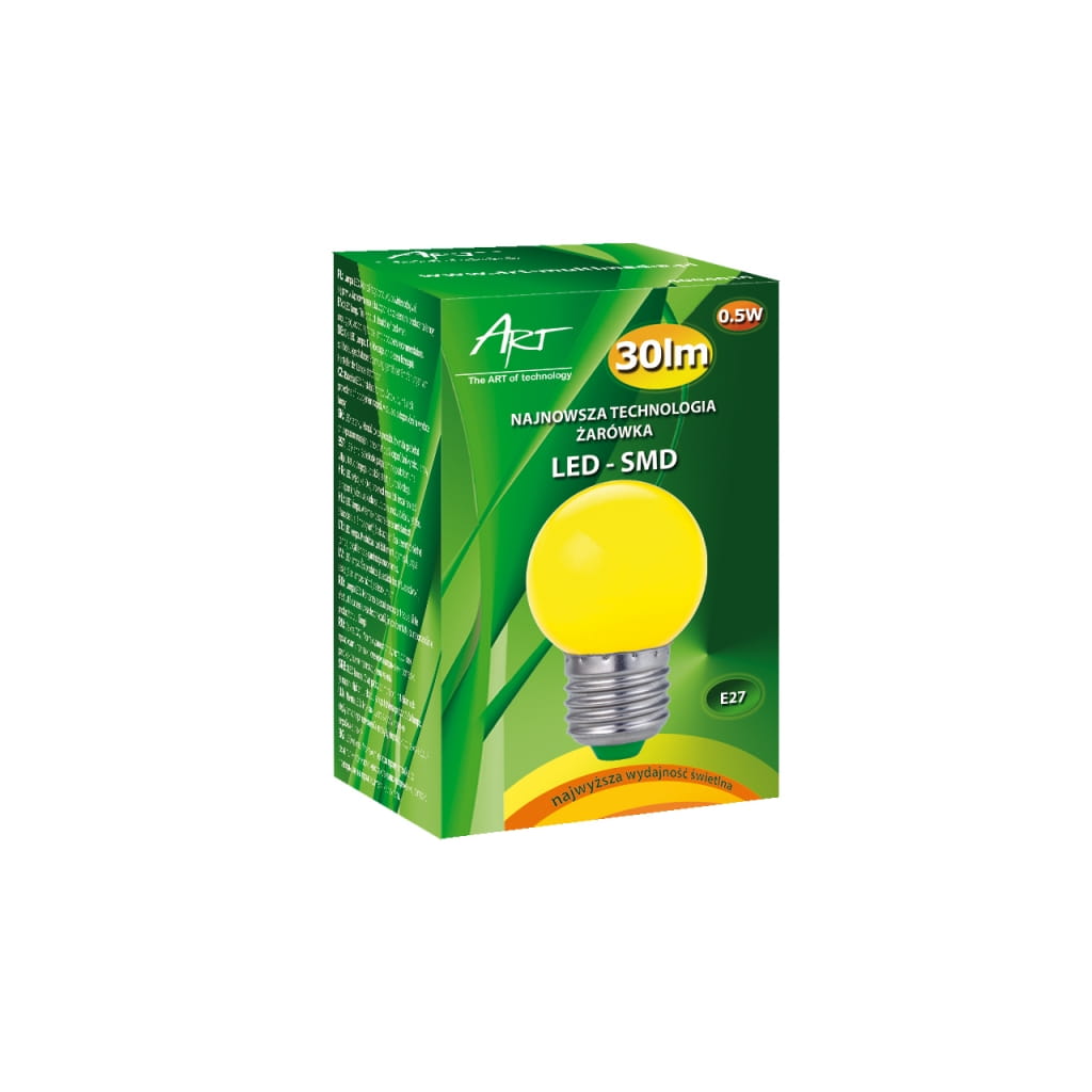 Producent: ART;Symbol producenta: 4004025;Rodzaj produktu: Żarówka LED;Moc: 0,5W;Mocowanie: E27;Rodzaj LED: SMD;Napięcie: AC230V;Barwa światła (K): Żółta;Moc strumienia świetlnego (lm): 30;Kąt świecenia (st): 180;Szerokość : 45 mm;Wysokość : 69 mm;Wymiary opakowania (mm): 47 x 72 x 47;Inne cechy: Kolorowa bańka;Gwarancja: 24 miesiące;Zużycie energii: 0.5kWh/1000h;Klasa energetyczna: A++;Liczba cykli włącz/wyłącz: >15 000;Czas nagrzewania: <1s;Trwałość: 30 000h;CRI/Ra: >80;Czas zapłonu: <1s;Współczynnik mocy: 0,6;LLMF: 0,65;Przeznaczenie do ściemniania: Nie;Przeznacznie do oświetlenia akcentowego: Nie;Znak bezpieczeństwa/zgodności: CE;Dopuszczenie do obrotu w RP: Tak;Kraj pochodzenia: Chiny;