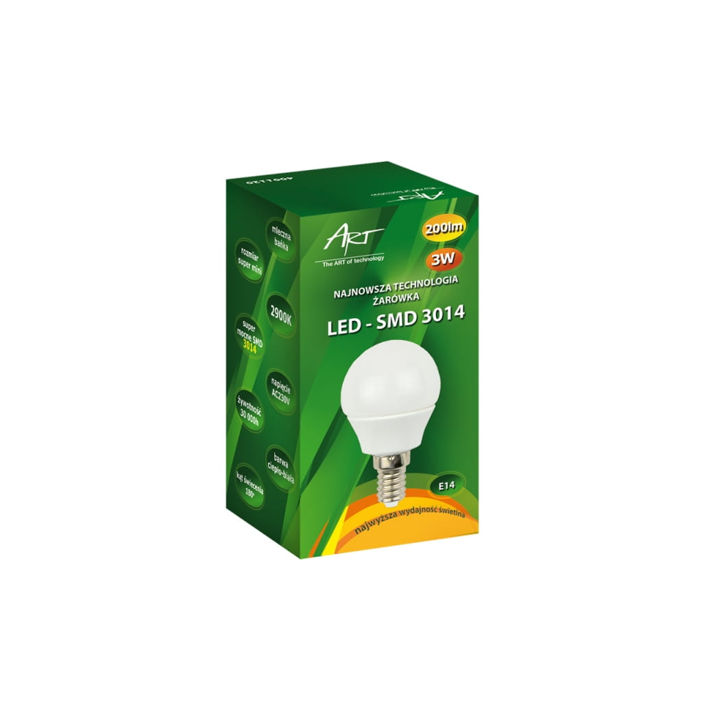 Producent: ART;Symbol producenta: 4001125B;Rodzaj produktu: Żarówka LED;Moc: 3W;Mocowanie: E14;Ilość diod LED: 24;Napięcie: AC 230V;Barwa światła (K): 2900 (ciepło-biała);Moc strumienia świetlnego (lm): 200;Kąt świecenia (st): 180;Szerokość : 43 mm;Wysokość : 77 mm;Wymiary opakowania (mm): 48 x 90 x 48;Gwarancja: 24 miesiące;Zużycie energii: 3kWh/1000h;Klasa energetyczna: A+;Liczba cykli włącz/wyłącz: >15 000;Czas nagrzewania: <1s;Trwałość: 30 000h;CRI/Ra: >80;Czas zapłonu: <1s;Współczynnik mocy: 0,6;LLMF: 0,65;Przeznaczenie do ściemniania: Nie;Przeznacznie do oświetlenia akcentowego: Nie;Znak bezpieczeństwa/zgodności: CE;Dopuszczenie do obrotu w RP: Tak;Kraj pochodzenia: Chiny;