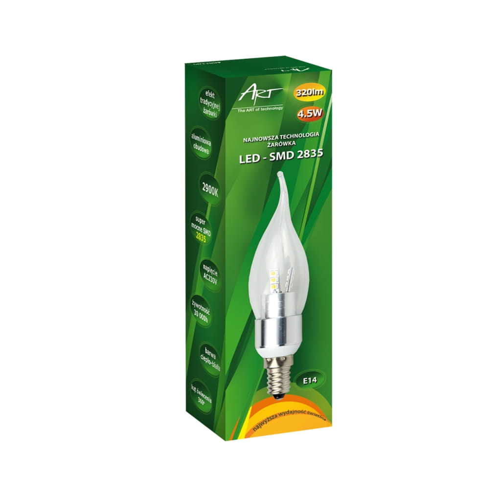 Producent: ART;Symbol producenta: 4001185B;Rodzaj produktu: Żarówka LED;Moc: 4.5W;Mocowanie: E14;Ilość diod LED: 18;Rodzaj LED: SMD 2835;Napięcie: AC 230V;Barwa światła (K): 2900 (ciepło-biała);Moc strumienia świetlnego (lm): 320;Kąt świecenia (st): 360;Szerokość : 30 mm;Wysokość : 140 mm;Materiał wykonania: Aluminium, mleczne szkło;Wymiary opakowania (mm): 38 x 135 x 38;Inne cechy: Klasa energetyczna A+;Gwarancja: 24 miesiące;Zużycie energii: 4.5kWh/1000h;Klasa energetyczna: A+;Liczba cykli włącz/wyłącz: >15 000;Czas nagrzewania: <1s;Trwałość: 30 000h;CRI/Ra: >80;Czas zapłonu: <1s;Współczynnik mocy: 0,6;LLMF: 0,65;Przeznaczenie do ściemniania: Nie;Przeznacznie do oświetlenia akcentowego: Nie;Znak bezpieczeństwa/zgodności: CE;Dopuszczenie do obrotu w RP: Tak;Kraj pochodzenia: Chiny;